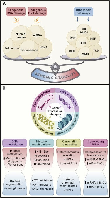 基因组完整性和稳定性普遍受到外源化学、物理和生物因素以及内源性挑战(例如DNA 复制错误、染色体分离缺陷、氧化过程和自发水解反应)的威胁。由这些外在或内在的损伤来源引起的广泛的遗传损伤包括点突变、缺失、易位、端粒缩短、单链和双链断裂、染色体重排、核结构缺陷以及由整合引起的基因破坏。病毒或转座子。所有这些分子改变和由此产生的基因组嵌合可能导致正常和病理性衰老。3因此,生物体进化出了一系列复杂的DNA 修复和维护机制,以应对核 DNA 和线粒体DNA (mtDNA) 造成的损伤,并确保适当的染色体结构和稳定性。这些DNA 修复网络会随着年龄的增长而失去效率,从而加剧基因组损伤的积累和细胞质4中 DNA 的异位积累(图 2 A)。