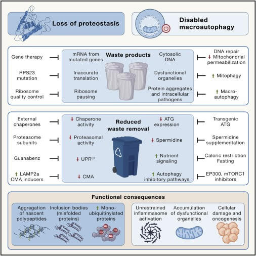 蛋白质稳态丧失和巨自噬功能丧失的特点是偏离年轻平衡状态,其中废物的积累是由各种与年龄相关的变化引起的,同时废物的清除通过各种机制受到损害。列出了这些改变的功能后果。左侧和右侧举例说明了一些重建蛋白质稳态和自噬的策略。