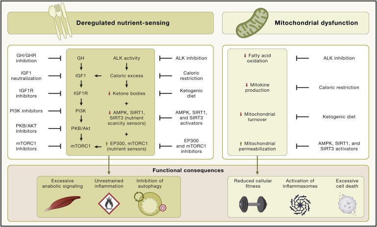 显示了一个简化版本的相互交织的营养途径,用于解除对营养感应的管制,并提供恢复营养感应的可能对策。值得注意的是,营养感应网络活性的降低会影响衰老过程中代谢调节以外的许多过程,包括对各种压力源的抵抗、修复机制的激活、自噬刺激或炎症控制。同样,对于线粒体功能障碍,列出了一系列与年龄相关的变化及其可能的解毒剂。与年龄相关的代谢改变的功能后果(其中一些与衰老的其他标志相关)在图的下半部分举例说明。