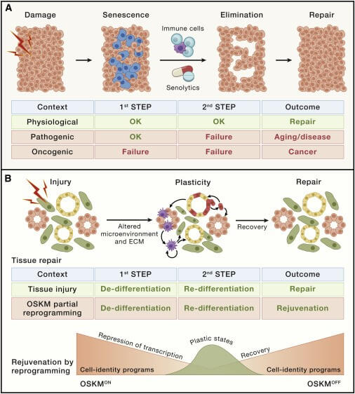 (A) 细胞衰老通常会促进损伤后的组织修复,并保护生物体免受致癌损伤。这是通过两个步骤实现的:(1) 衰老的建立;(2) 招募免疫细胞,消除衰老细胞,从而促进组织修复。如果这些步骤中的任何一个失败,生物体就很容易患上疾病。