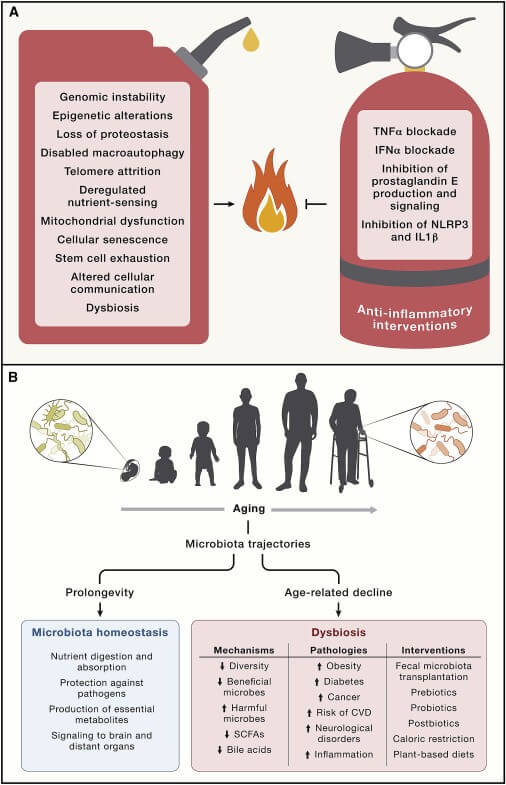 (A) 衰老过程中的慢性炎症是由所有其他特征引起的多种紊乱的结果。图中右侧部分显示了抗炎干预措施对健康和寿命产生积极影响的几个代表性例子。